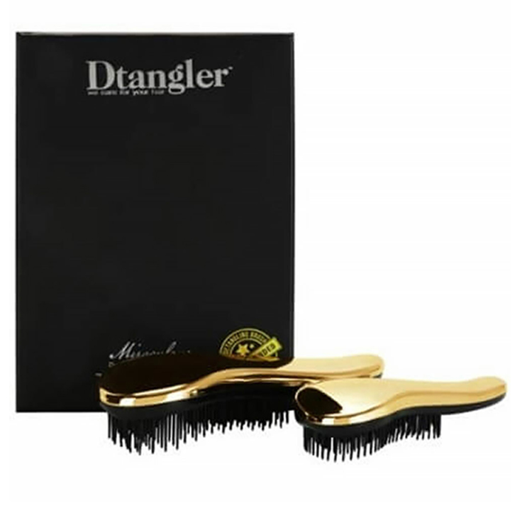 Luxusní dárkové balení 2 zrcadlově lesklých zlatých kartáčů Dtangler v limitované edici. Větší kartáč používejte pro domácí péči. Menší byl inspirován módními trendy a je ideální do kabelky nebo na cesty.